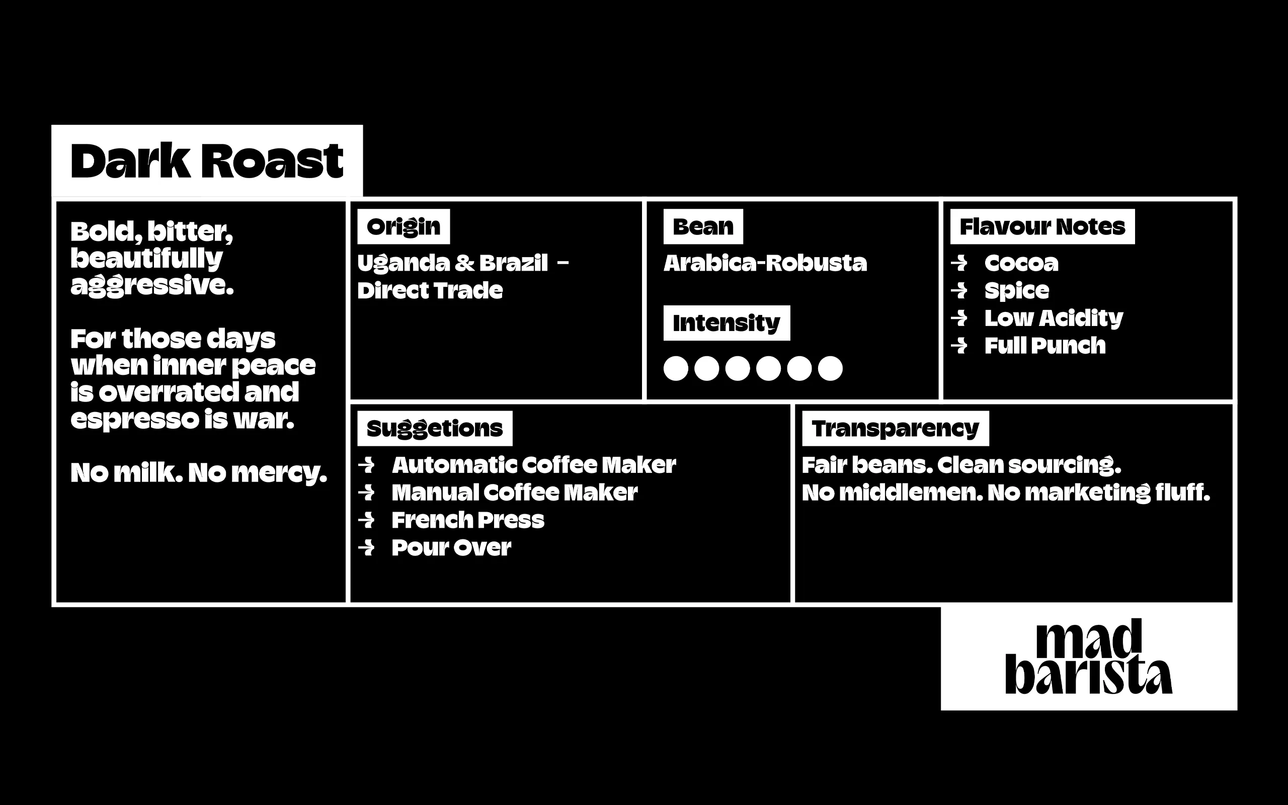 Mad Barista ist ein urbanes Kaffee-Label mit eigener Rösterei – entstanden aus dem Wunsch, endlich mit der überästhetisierten Coffee-Wellness-Welt zu brechen. Kein Barista-Pathos, keine Duftnotenpoesie, kein Feelgood-Floskelfilter. Stattdessen: ehrliches Design, zwei Sorten, maximaler Charakter.