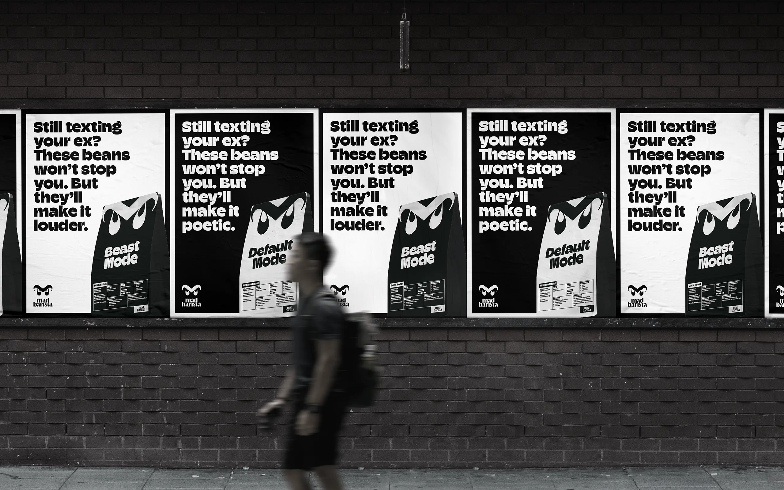 Das Packaging verzichtet konsequent auf Inszenierung und arbeitet mit starker Typografie, klarer Farbwelt und einem Sprachstil, der näher an Deadpool als an Designpreis liegt. Die Sorte wird zum Modus, der Text zur Haltung: selbstironisch, scharfzüngig, direkt. Statt Emotion wird Klartext serviert – egal ob auf der Packung, auf Plakaten oder auf dem To-Go-Becher.