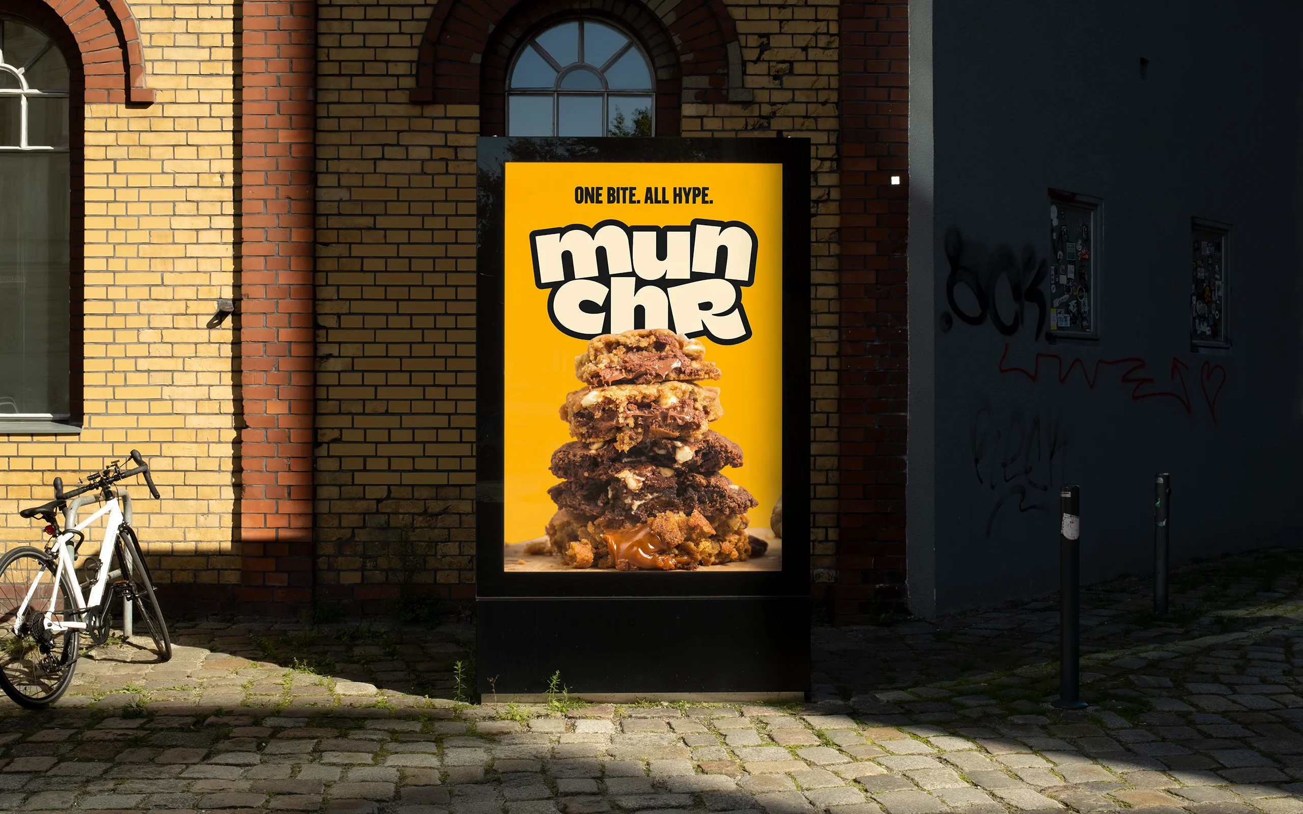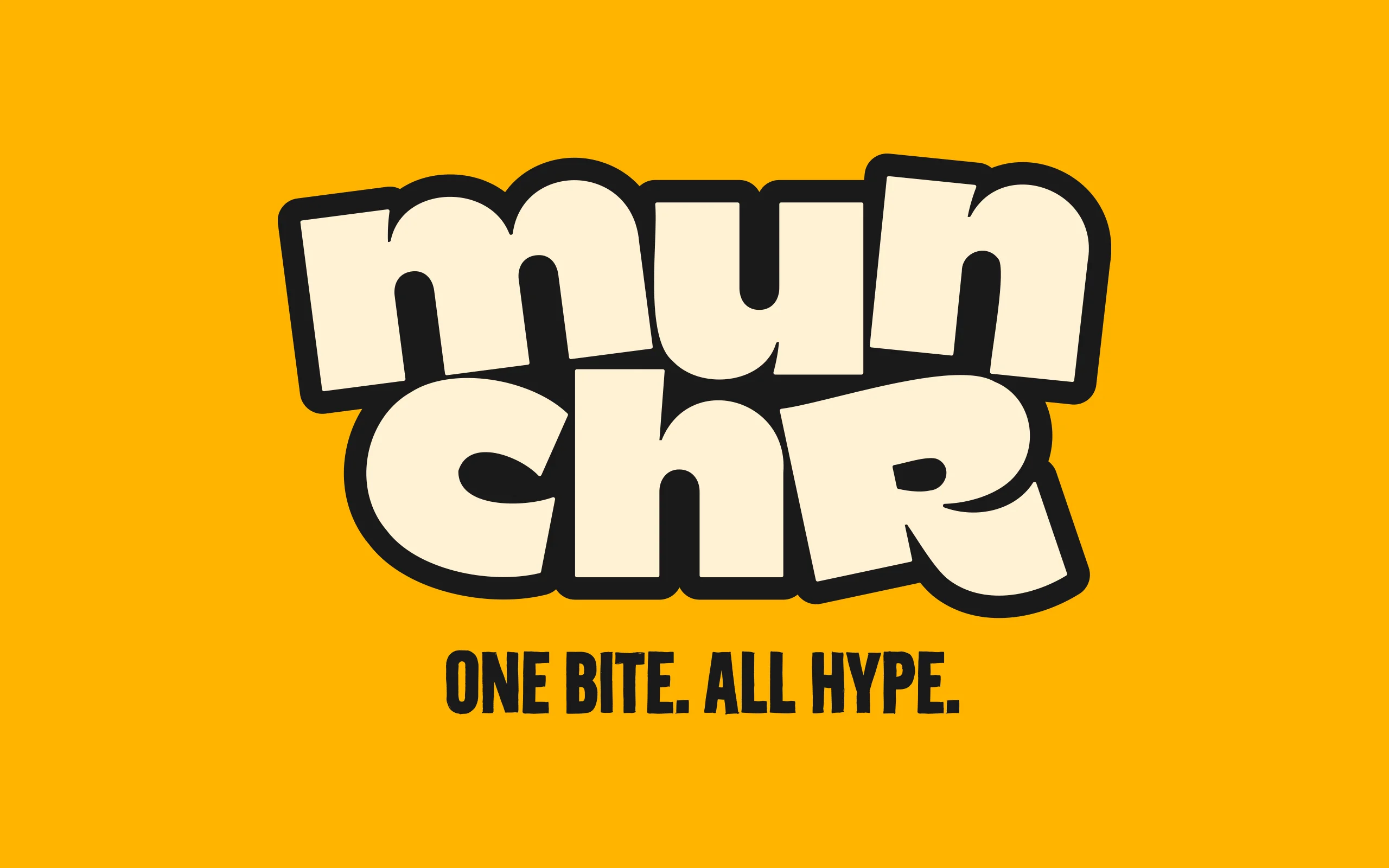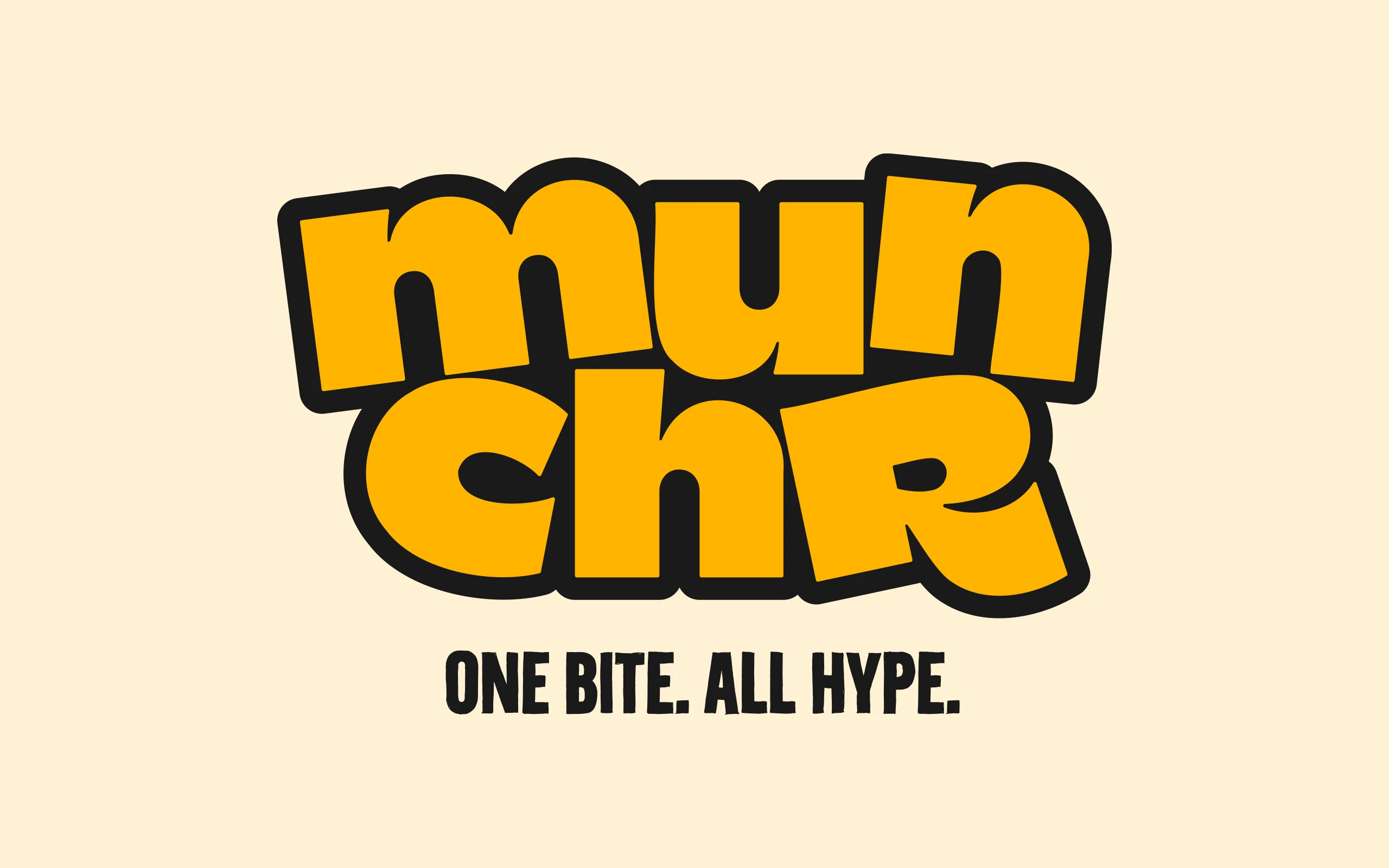Das Designsystem von munchr ist bewusst reduziert, aber extrem markant. Im Mittelpunkt steht das fette, zweizeilige Logo mit seinem charakteristischen Bounce, das in Kombination mit einer klaren Farbwelt aus kräftigem Gelb, Schwarz und Creme maximale Aufmerksamkeit erzeugt. Die Bildsprache zeigt Cookies heroisch, groß und ohne ablenkende Elemente, um Textur und Genussmoment in den Fokus zu rücken. Der Claim „One Bite. All Hype.“ bringt die Markenhaltung auf den Punkt und dient als wiederkehrendes Branding-Element. In Out-of-Home-Kampagnen wird das Prinzip großflächig ausgespielt, während Merchandise-Artikel das Logo als grafisches Statement nutzen — tragbar wie Streetwear, einsetzbar wie ein visuelles Markenzeichen.