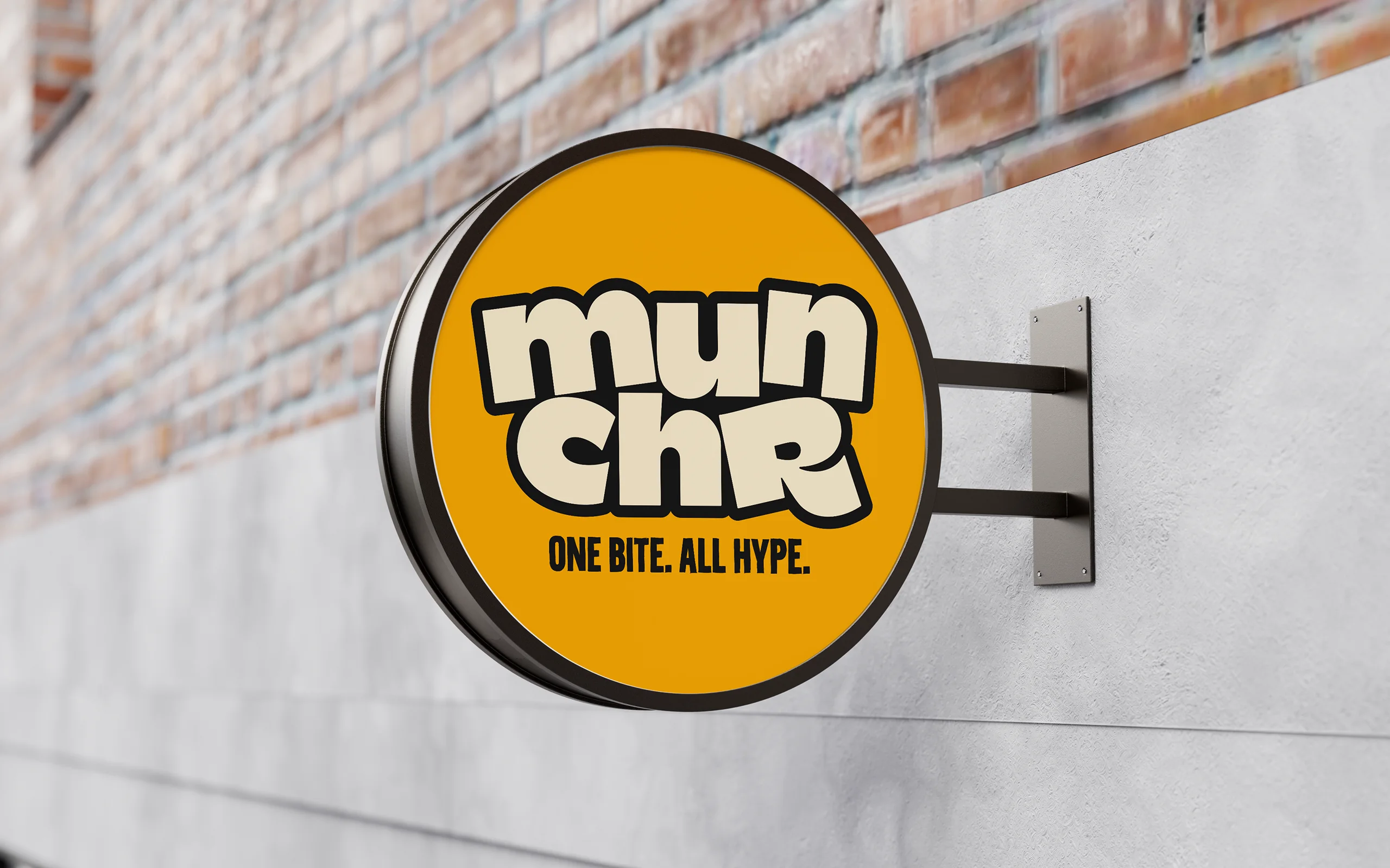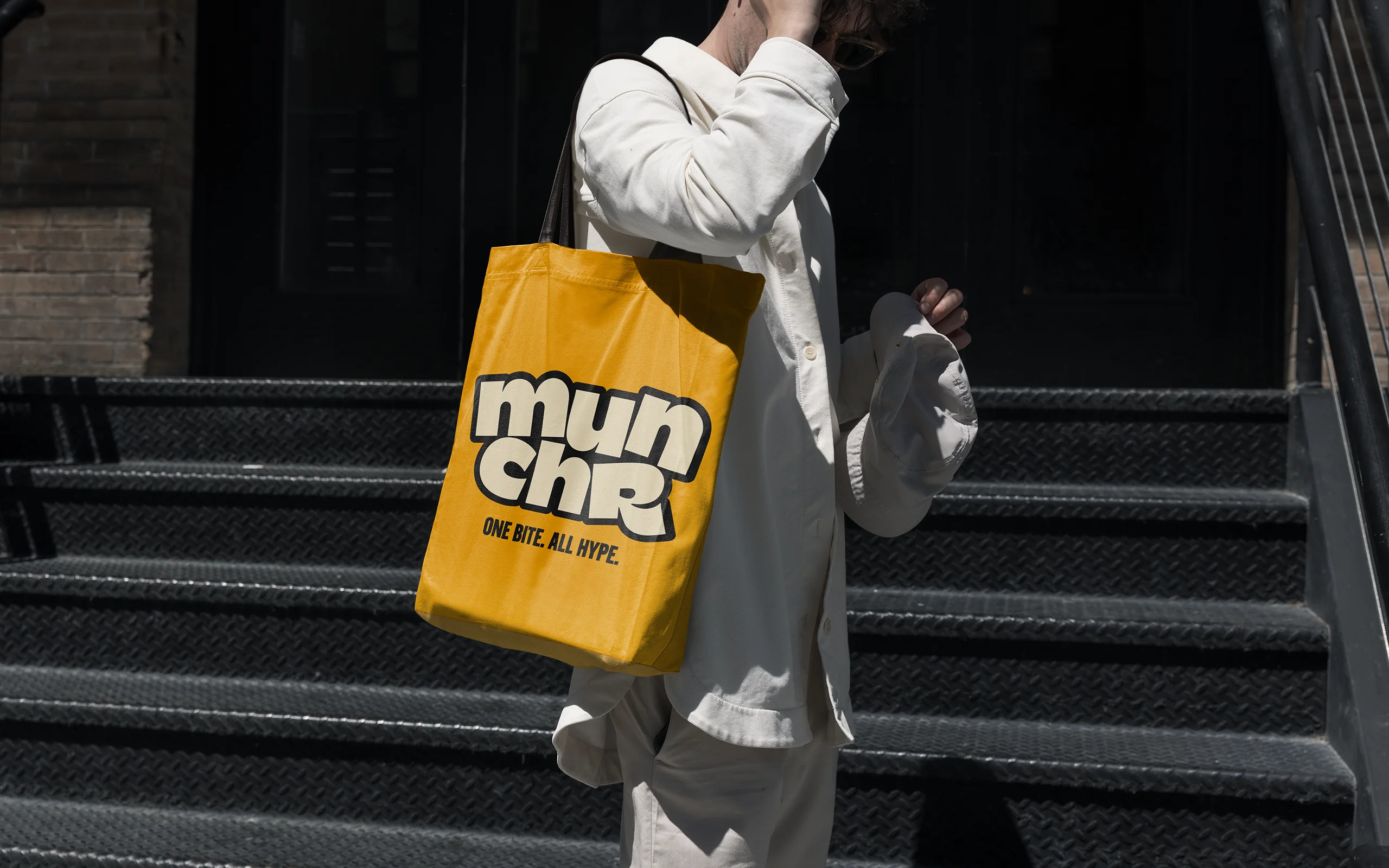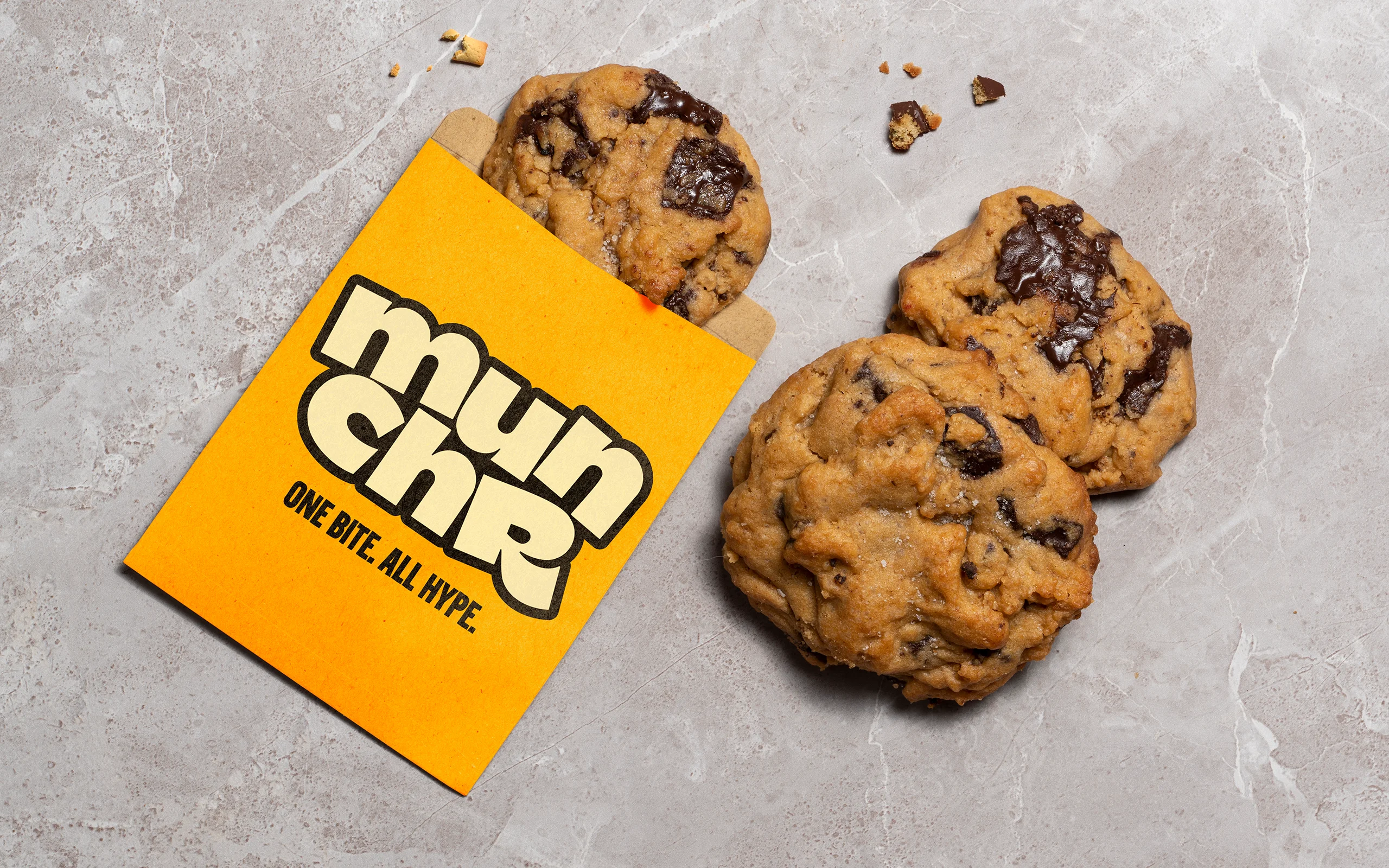 Das Designsystem von munchr ist bewusst reduziert, aber extrem markant. Im Mittelpunkt steht das fette, zweizeilige Logo mit seinem charakteristischen Bounce, das in Kombination mit einer klaren Farbwelt aus kräftigem Gelb, Schwarz und Creme maximale Aufmerksamkeit erzeugt. Die Bildsprache zeigt Cookies heroisch, groß und ohne ablenkende Elemente, um Textur und Genussmoment in den Fokus zu rücken. Der Claim „One Bite. All Hype.“ bringt die Markenhaltung auf den Punkt und dient als wiederkehrendes Branding-Element. In Out-of-Home-Kampagnen wird das Prinzip großflächig ausgespielt, während Merchandise-Artikel das Logo als grafisches Statement nutzen — tragbar wie Streetwear, einsetzbar wie ein visuelles Markenzeichen.